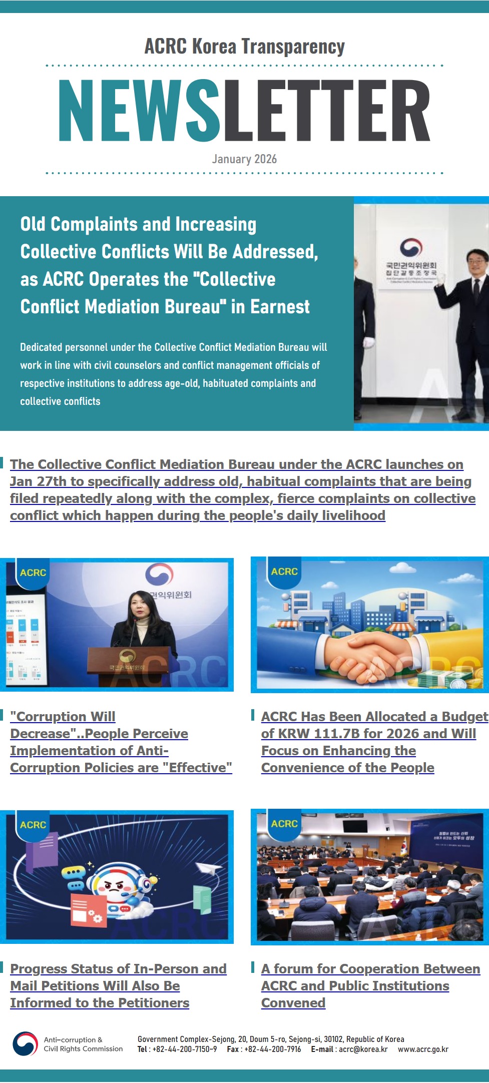 Se adjunta el ACRC Korea Transparency Newsletter (enero 2026) para su amable referencia. Agradeceremos mucho su interés y atención al contenido.
